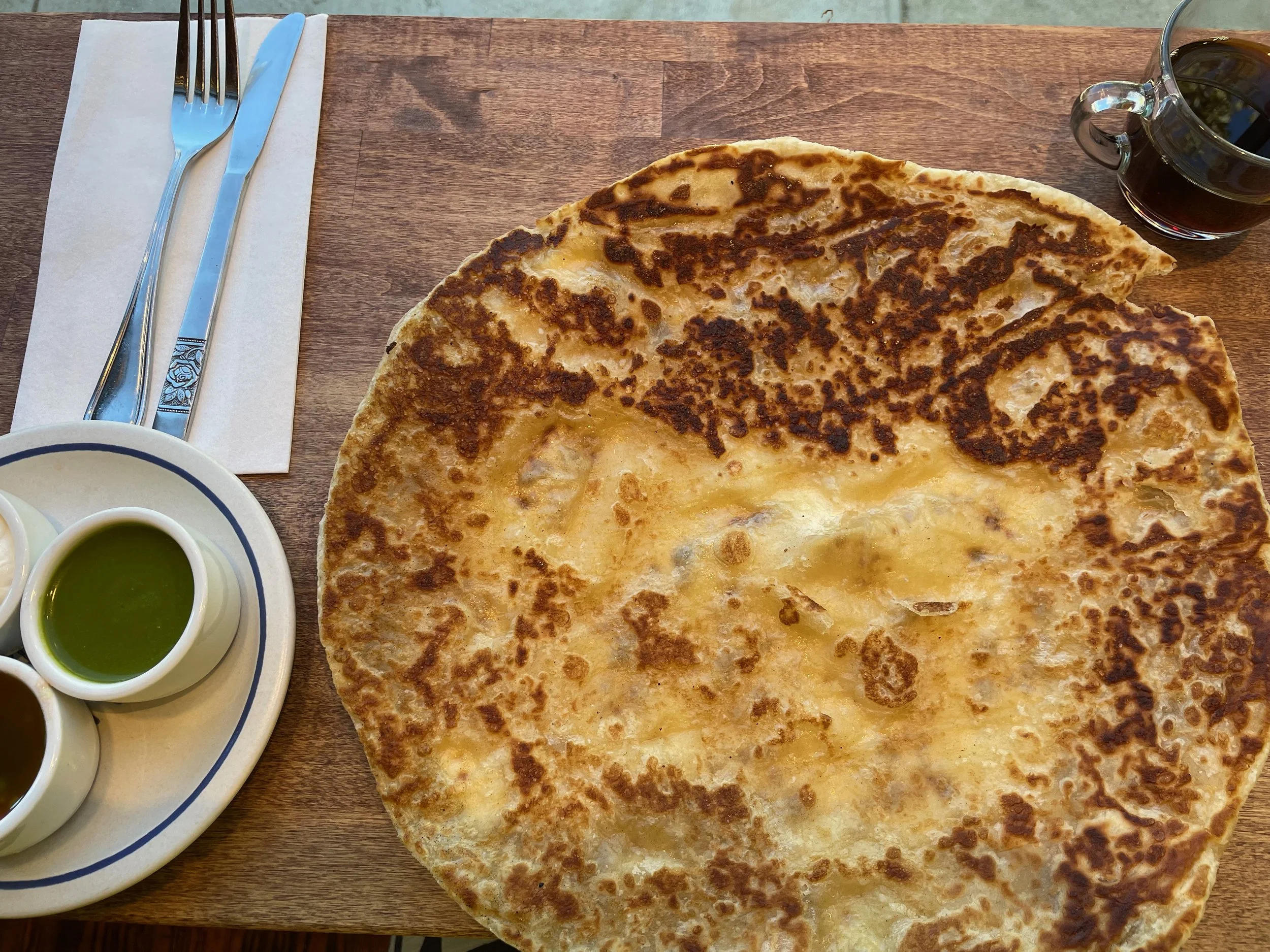 When I returned from Sedona, I continued my flatbread experiments, trying different flours and techniques inspired by Naomi Duguid and Jeffrey Alford’s flatbread atlas published 30 years ago. And then, I found malawach, a Jewish Yemenite breakfast bread similar to paratha. Hannah Goldfield mentioned malawach in her “Tables for Two” column in The New Yorker, which my husband reads aloud to me in bed, and my curiosity took me to Edith’s in Williamsburg to try it. The bread was as big as the plate, served with the traditional accompaniments, grated tomato and green chile s'ḥug, as well as homemade jam and labne. I ate the whole thing. The laminated dough was like a flat fried croissant, and when I held a piece up to the window, I could see the light through it. “What’s the recipe?” I asked the waitress. “Chef’s secret,” she replied. Fair enough. My flatbread ambition had new direction.