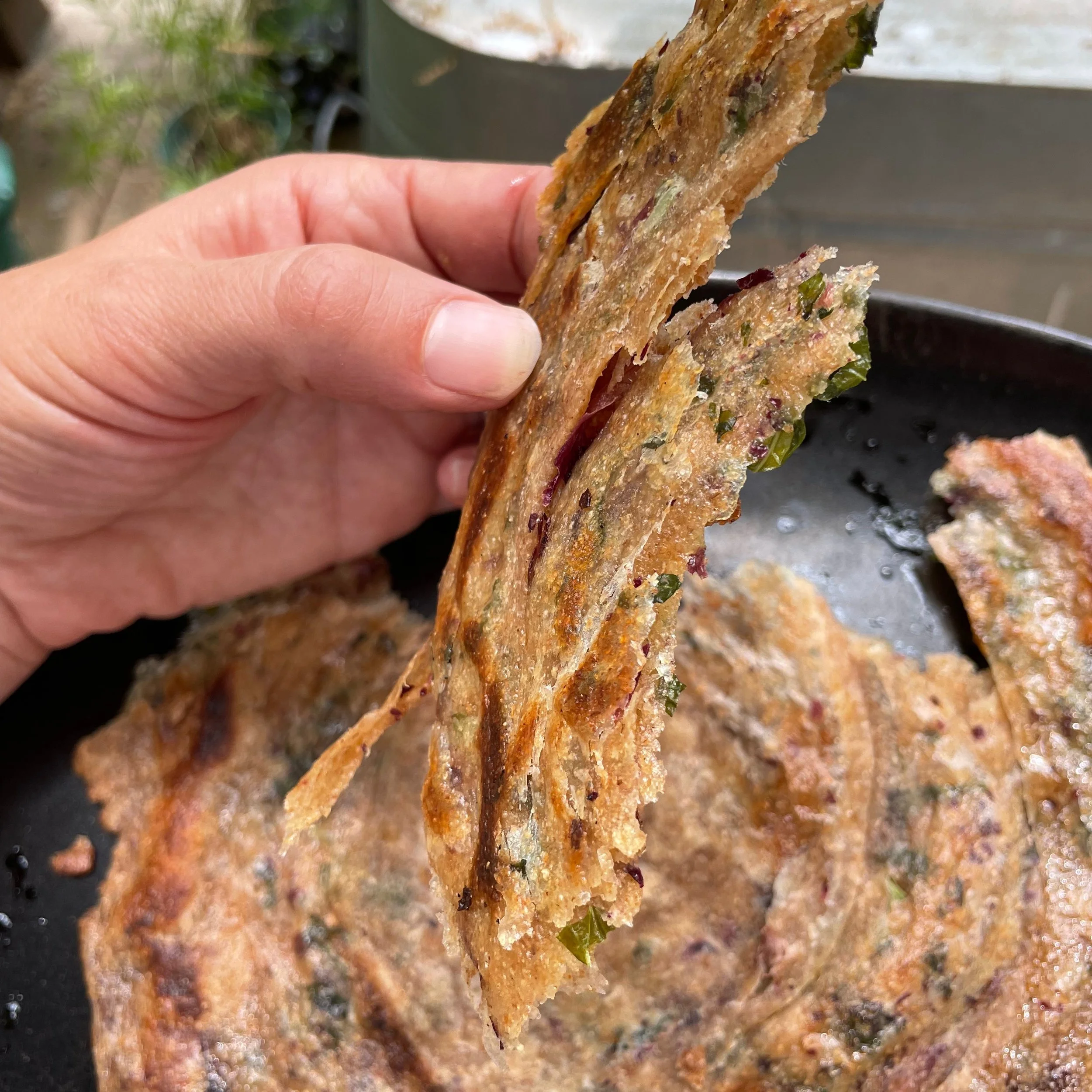 I ate my ambition with my hands, dipping crispy edges in thick yogurt but mostly savoring the flatbread plain. The mix of grains, leaves, and petals tasted alive. The vision held between the speckled flaky layers was beautiful, and the spiraling journey to get there is my own.