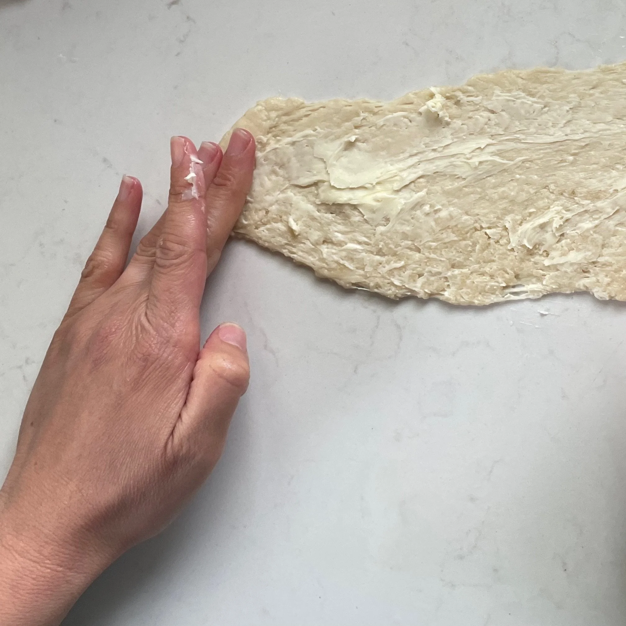 I turned to a basic recipe for malawach from a borrowed copy of The Jewish Cookbook by Leah Koenig, its blue cover embossed with gold and silver spirals. The results were promising, more pliable than previous flatbread techniques I’d used. Laminating dough sounds intimidating, but when I actually spread the butter across the dough with my fingers, I loved it, like a child painting. It was not difficult, but it did require time and dedication. I rolled the buttered dough into snakes and snails, flattened it, fried a few. I ate them, and I knew I could go further.