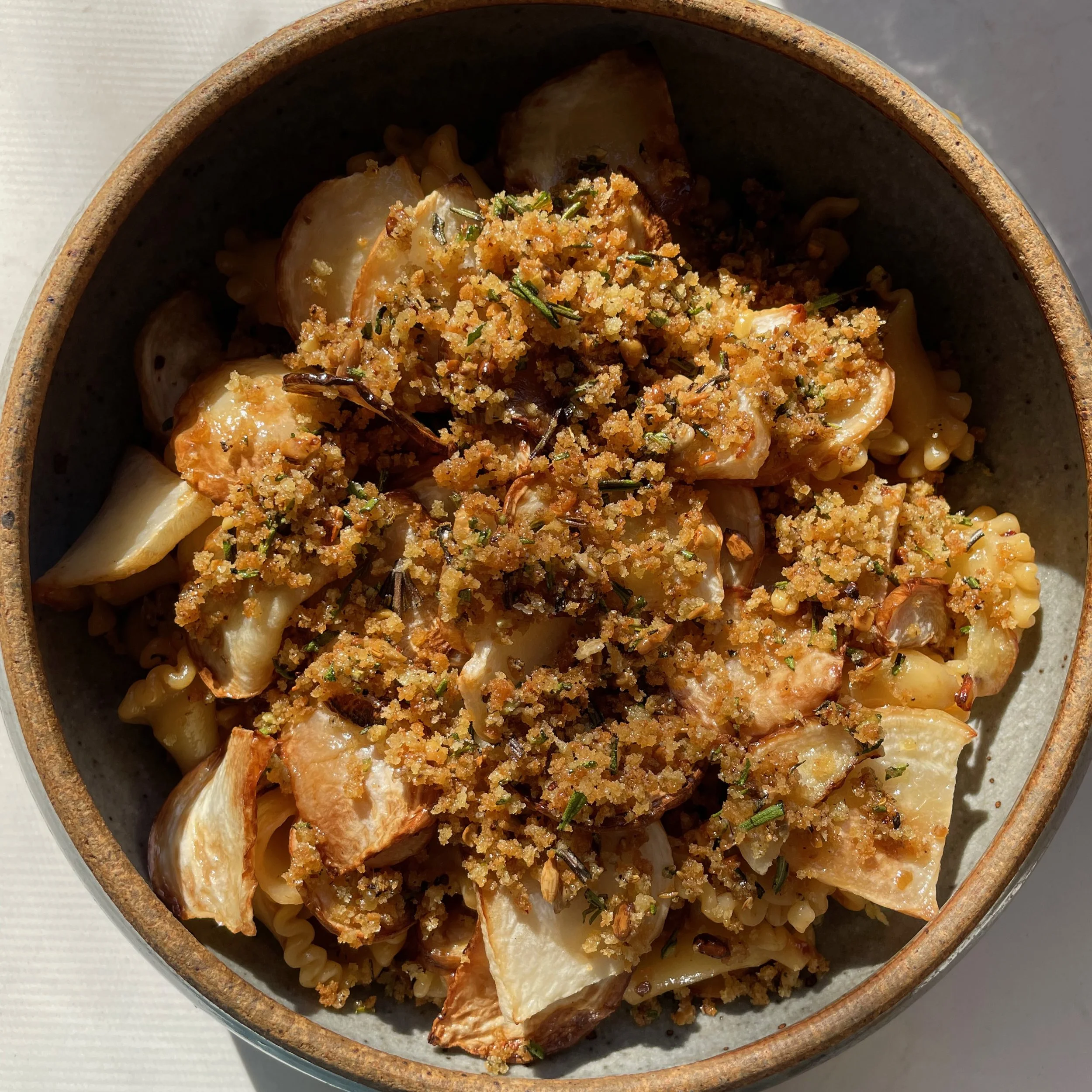 When the pasta is done and nicely mixed with the turnips, sprinkle breadcrumbs on top and serve.